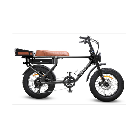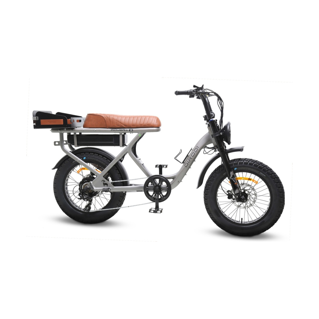 The DiroDi Rover Gen 6 features a powerful 52V system, a 52V 20Ah Samsung battery, and a car-grade front light with four modes, including a yellow fog light mode. The bike offers two motor options: 250W (500W). It includes premium KKE front suspension forks on the Plus model, a colourful display, an integrated rear rack with a 50 kg max load, an optional 52V 20A secondary battery, and various accessories such as an upgraded premium rear basket (included), an optional front basket, and a central storage box.