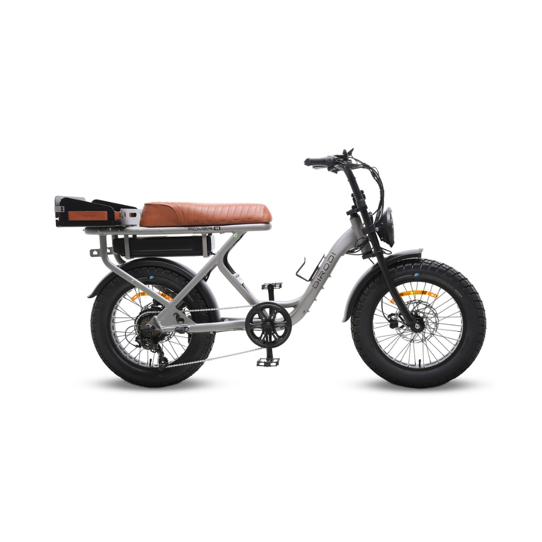 The DiroDi Rover Gen 6 features a powerful 52V system, a 52V 20Ah Samsung battery, and a car-grade front light with four modes, including a yellow fog light mode, a colourful display, an integrated rear rack with a 50 kg max load, an optional 52V 20A secondary battery, and various accessories such as an upgraded premium rear basket (included), an optional front basket, and a central storage box.